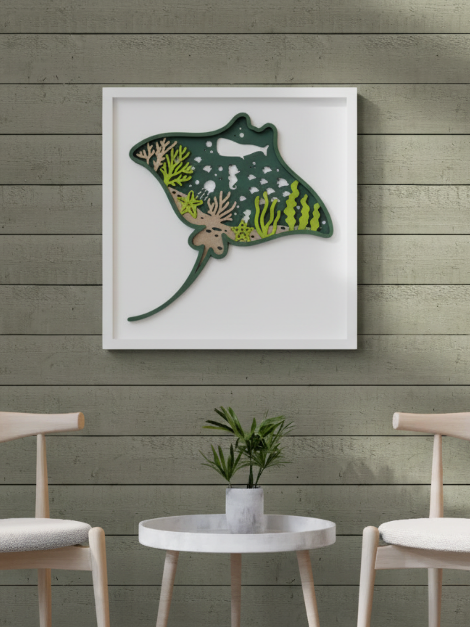 Mysterious, graceful and endlessly free – the stingray glides through the depth with silence power. This handcrafted multilayer artwork captures that mesmerizing motion in sculpted detail, blending modern design oceanic mystique. Each layer is precisely cut and assembled to create depth and texture – like ripples of water frozen in time. The natural tones and flowing contours echo the calm rhythm of the sea, reminding us to move with grace, adapt and trsut the current of life.