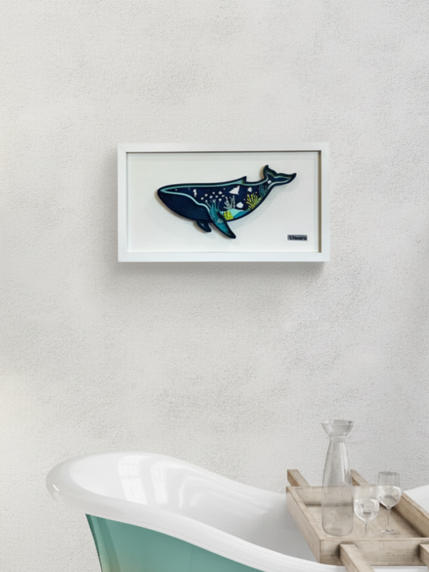 Dive into serenity with our Ocean Whale multilayer artwork – a captivating tribute to the beauty and soul of the sea. Each layer is carefully designed and laser-cut from premium plywood, creating deph and motion that brings the ocean to life. Shades of blue and turquoise blend harmoniously to orm gentle waves surrounding the majestic whale – a timeless symbol of strenght, freedom and peace. Hand-painted with care and framed with natural elegance, this piece transforms any space into a calm ocean escape.